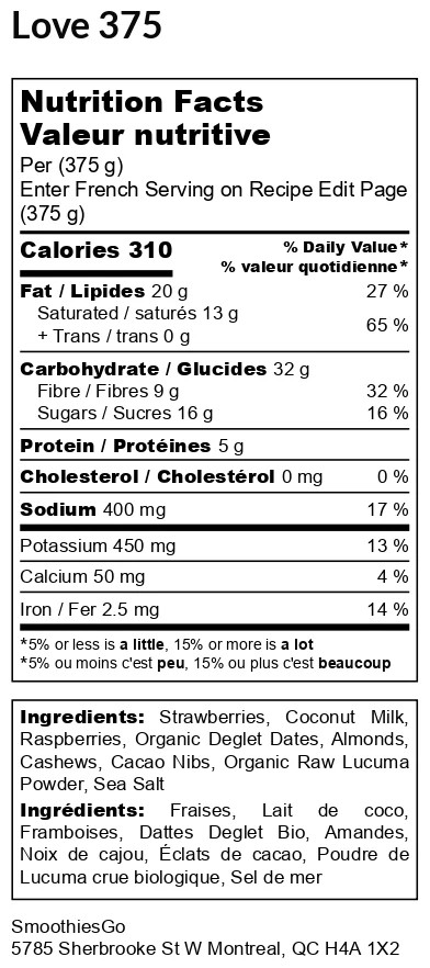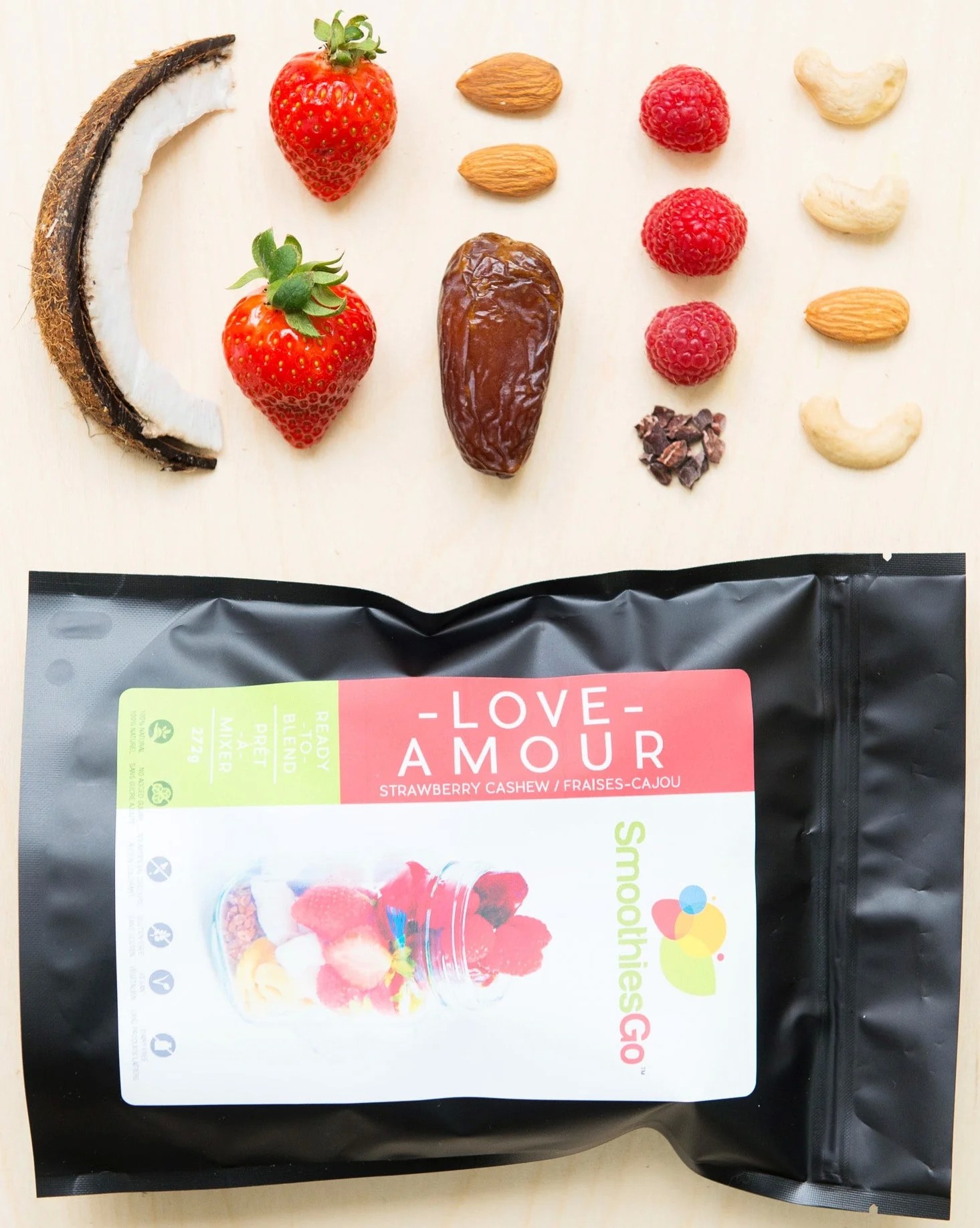 A delicious, milkshakey, berry-packed smoothie that's amazingly good for you: strawberries help burn fat and reduce inflammation; raspberries and dates are full of fibre and vitamins; organic coconut milk hydrates your body and gives you the benefits of fibre, magnesium, potassium, and manganese; and almonds and cashews give a punch of protein and help reduce bad cholesterol levels. This smoothie is perfect to help control your appetite; so good, and so good for you! Our smoothies are all made so they'll taste great mixed with just water, but you can use 1 cup of any liquid you like, including milk,almond milk, soy milk, or coconut milk for an even creamier blend!